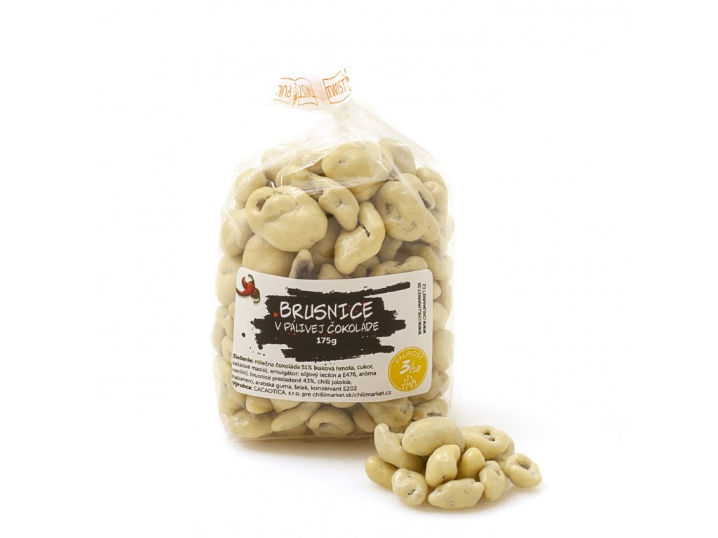 Zloženie: brusnice presladené (43%) čakanková vláknina, Firbulín, biela 51% kakaová hmota, cukor, kakaová maslo, sušená srvátka, emulgátor: sójový lecitín; aróma: prírodná vanilka; Chilli: Moruga scorpion, arabská guma a šelak, konzervant E202